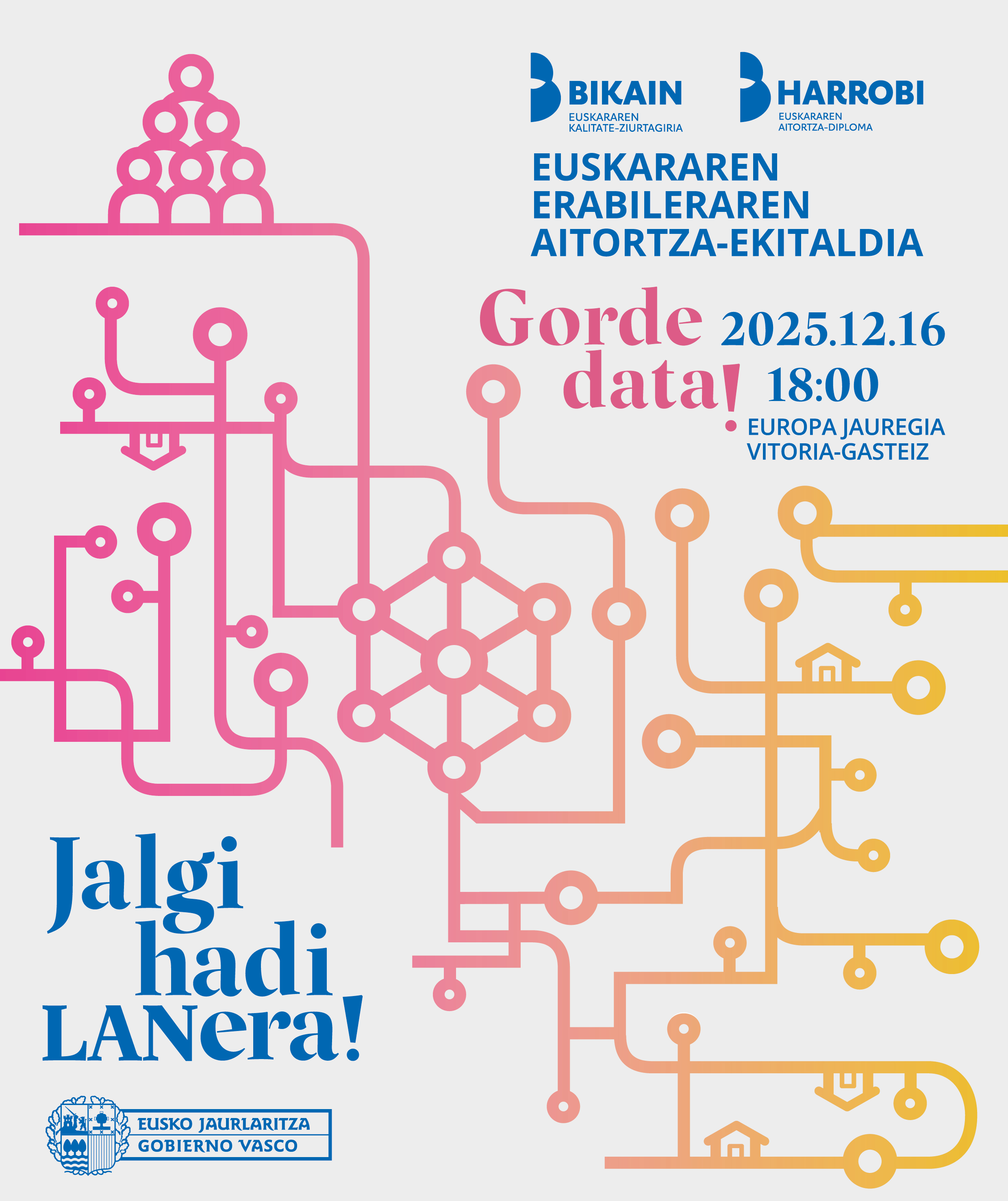 Bernat Etxeparek 1545. urtean “Kontrapas” poeman euskara plazara, mundura eta dantzara ateratzeko beharra aldarrikatzen zuen. Eta Xabier Letek, 1974. urtean, hitz horiek guztion oroimenean iltzatu den kantu bihurtu zituen. 2025eko Euskararen Erabileraren Aitortza-Ekitaldian, Etxepare eta Leteren baimenarekin, beste aldarri bat gehitu dugu: Euskara jalgi adi lanera!!!