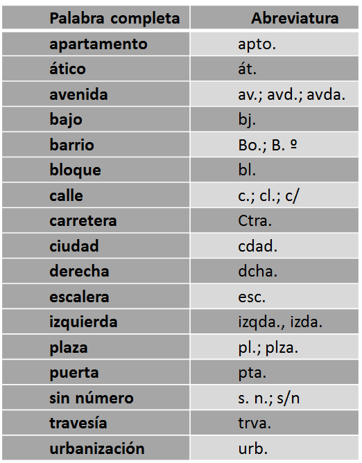 Es habitual utilizar abreviaturas en las direcciones postales. Por norma general, se recomienda usar palabras completas, pero en las direcciones son habituales los problemas de espacio, por lo que resultan convenientes. Las abreviaturas siempre se escriben con punto, y llevan tilde si la palabra entera se escribe con tilde. Estas son algunas de las abreviaturas más comunes: