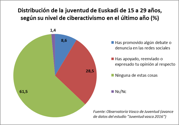 Algo más de un tercio de la juventud vasca (37,1 %) utilizó durante el pasado año las redes sociales para promover algún debate, denunciar alguna situación, apoyar o dar su opinión sobre alguna cuestión.