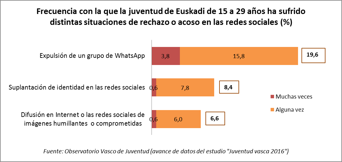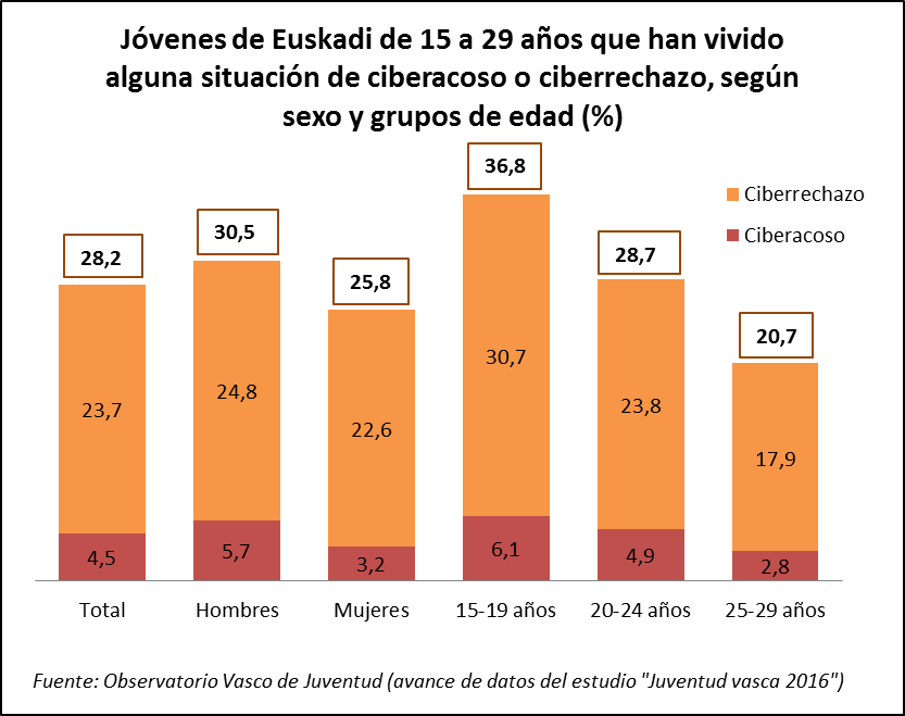 De acuerdo a estas definiciones podemos señalar que el 4,5 % de la juventud vasca ha sufrido algún tipo de ciberacoso y otro 23,7 % alguna situación de “ciberrechazo”. En total un 28,2 % de la juventud ha tenido alguna experiencia personal de rechazo o acoso en las redes sociales.