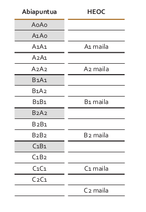 | A1 | A2 | B1 | B2 | C1 | C2 | Orduak guztira | |