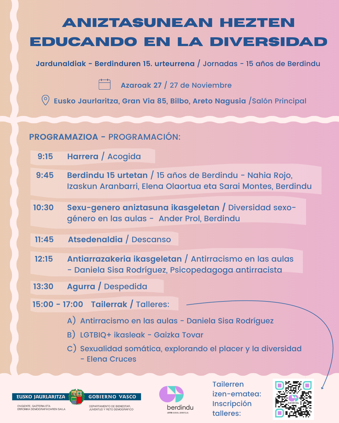 Este año celebramos el 15º aniversario de Berdindu, el servicio del Gobierno Vasco de atención a la diversidad sexual y de género. Para conmemorar este recorrido, vamos a organizar una jornada abierta, con el objetivo de reflexionar colectivamente sobre el recorrido de Berdindu así como los retos y avances en la construcción de espacios más inclusivos.