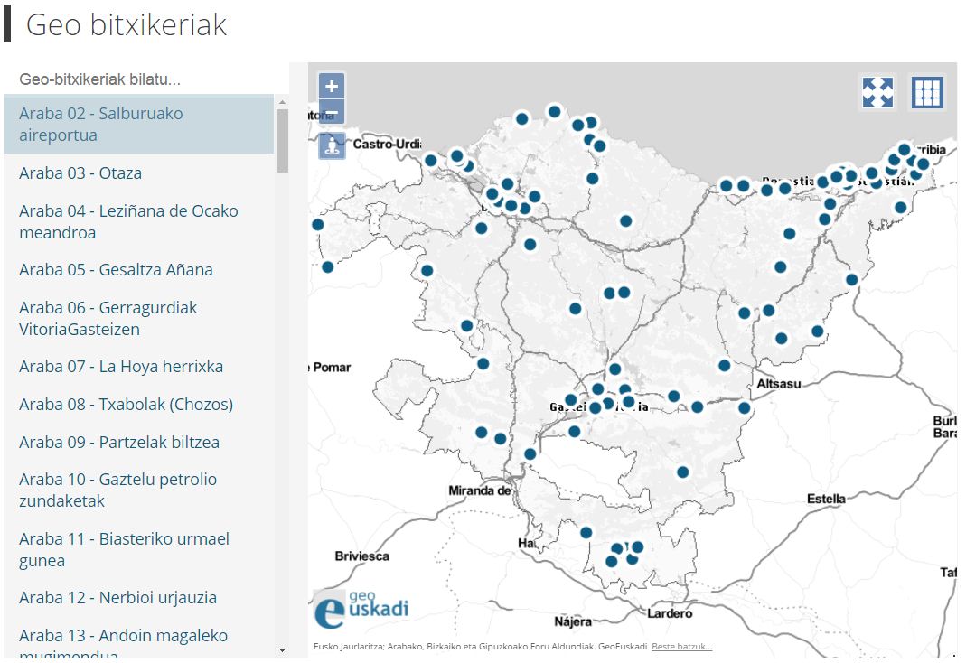 Geobitxikeria horiek aplikazioaren zerrendatik kontsultatu ahal dira, baita mapan sakatuta ere. Horietako bat aukeratutakoan, atzemandako fenomenoari buruzko azalpen sakona ematen duen PDF bat sortzen da. Aplikazioan nabigatu eta puntu ezberdinak aukeratu ahala, mapak hondoko informazio geografikoa erakutsiko du; horrela aukeratutako gaia hobeto ulertuko da.