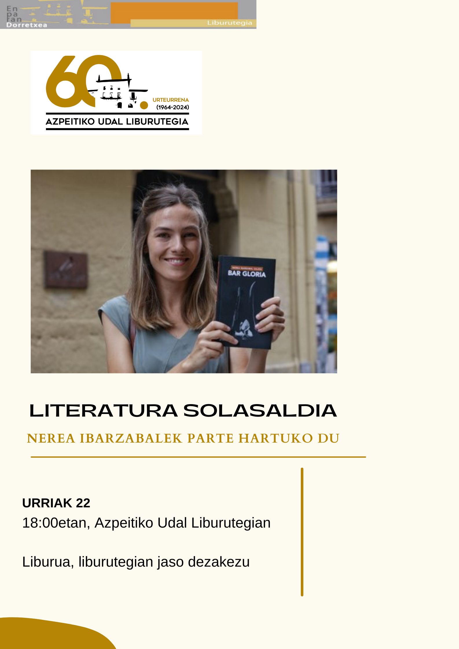 Urriak 22ko Literatura Solasaldian, Nerea Ibarzabalen Bar Gloria eleberriari buruz arituko gara Argitalpen-data: 2024/09/21
