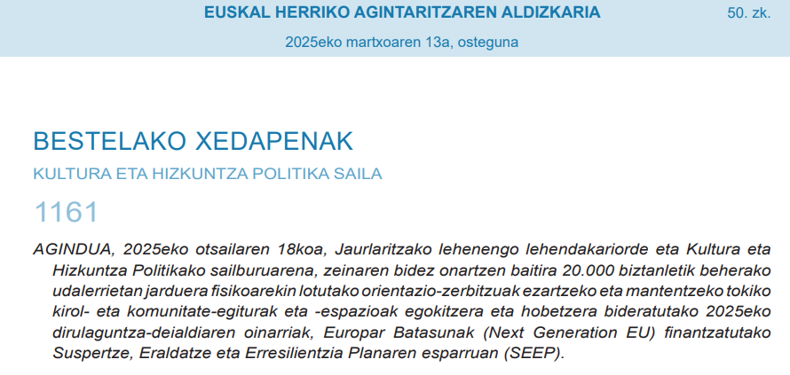 20.000 biztanle baino gutxiagoko udalerrietan jarduera fisikoko zerbitzuak ezartzen diren tokiko kirol- eta komunitate-egiturak eta -espazioak egokitzeko eta hobetzeko 2020ko otsailaren 1etik deialdi hau Euskal Herriko Agintaritzaren Aldizkarian argitaratzen den egunera arte egindako jarduketak finantzatuko dira.