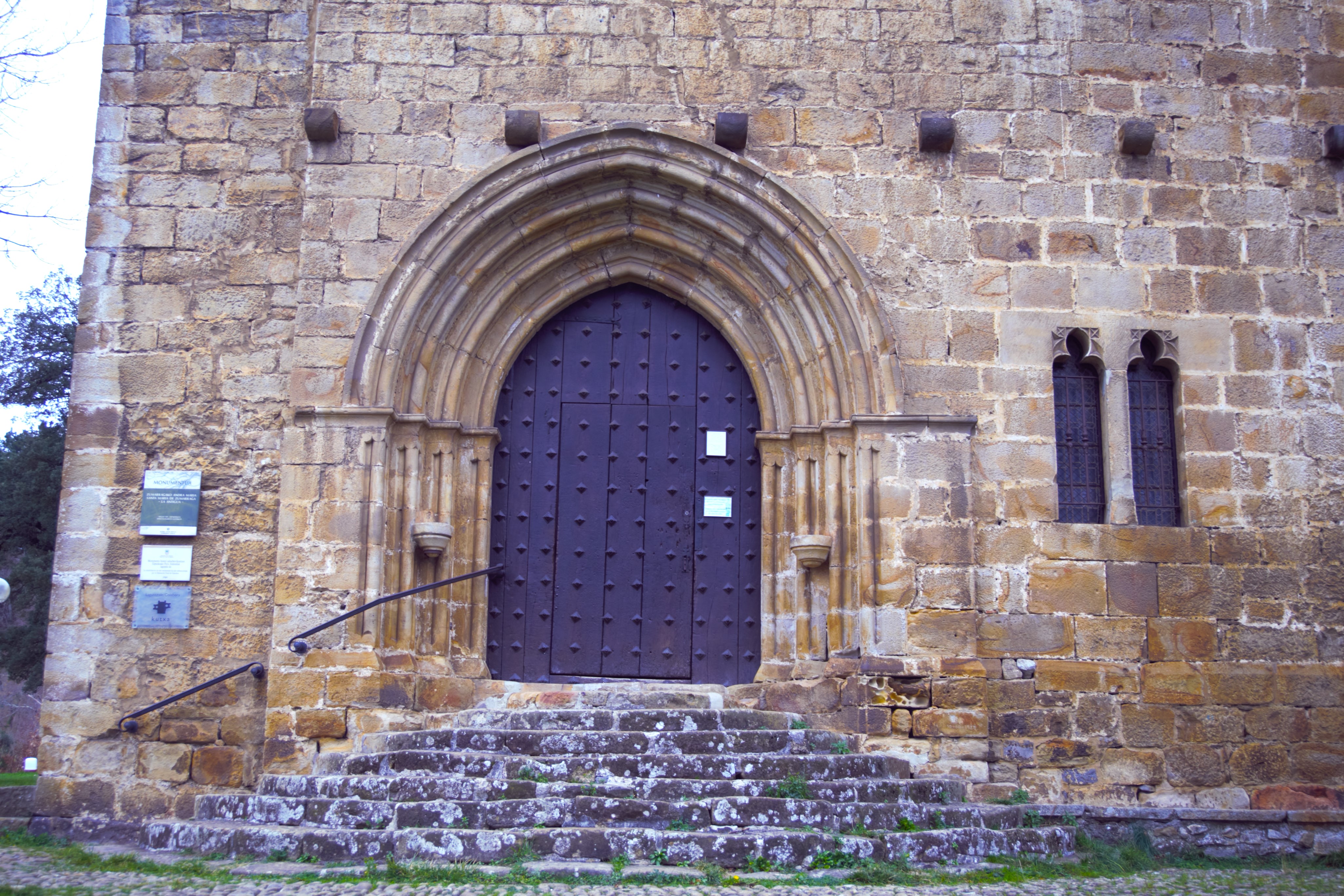 Oinplano angeluzuzeneko eraikina da eta burualde trapezoidal nabarmena du. Kanpoko hormak hareharrizko harlanduz eta kareharrizko harlanduxkoz eraikita daude, baita harlangaitz heterogeneoz ere. Horrela, argi eta garbi ikus daitezke eraikuntza-fase batzuk, eta zaharrena sarrerako atearen horma-atala da. Horma horretan bao txaranbeldu bat irekitzen da, lau ojiba-arkibolta soilekoa, ia apaingarririk gabea, eta harmailadia du atera iristeko. Ondoan, bi leiho lobulatu daude, eta tenpluaren Behe Erdi Aroko kronologia berresten dute. Hala ere, zenbait egilek erromanikoaren aztarnak ikusi dituzte atean. Sarrera 6 mentsularen gainean kokatzen zen arkupe batek babesten zuen, eta oraindik ikusgai daude mentsula horiek. Burualdean, non 1480ko inskripzio bat ageri den, erdi-puntuko arku batean kokaturiko kalbario bat nabarmentzen da eta, multzoaren azpian, erdi-puntuko leiho bat.