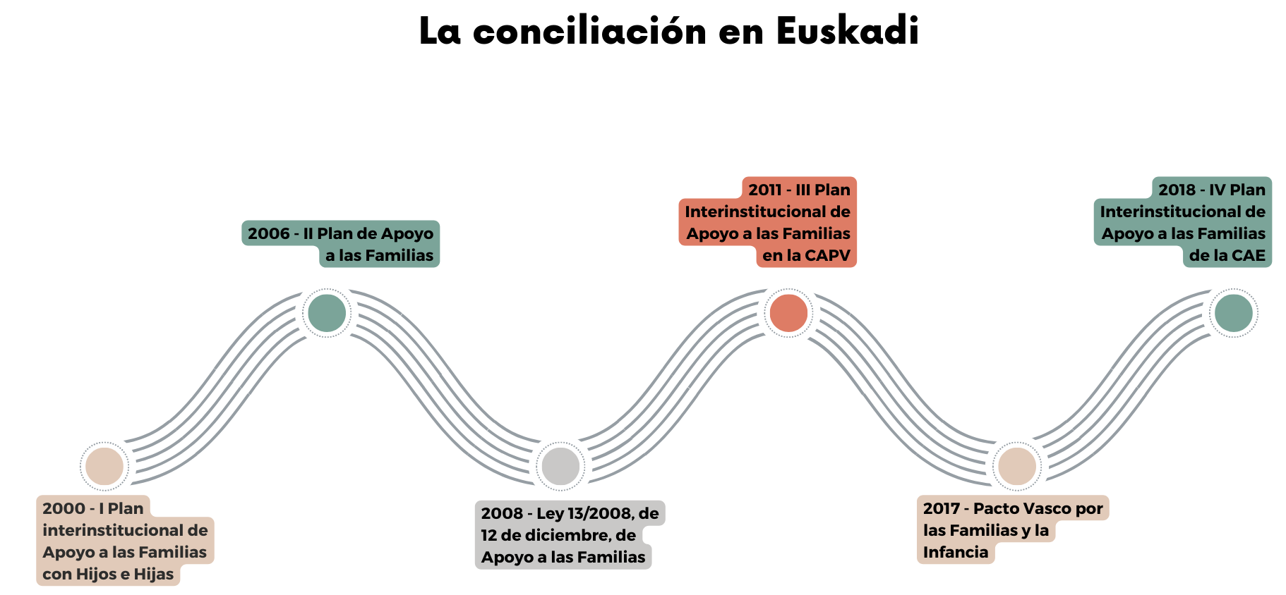El III Plan Interinstitucional de Apoyo a las Familias en la CAPV (2011) recoge un profuso conjunto de medidas dirigidas a fomentar la conciliación corresponsable, entre las que destacan el mantenimiento de las ayudas por conciliación de la vida familiar y laboral, el apoyo a iniciativas extraescolares que flexibilicen los horarios escolares y favorezcan la conciliación, la adecuación del servicio de redes comunitarias de personas cuidadoras de niñas y niños, el desarrollo de programas y campañas de sensibilización e información sobre conciliación y corresponsabilidad, la creación y mantenimiento del Portal de conciliación (Kontzilia), la elaboración de campañas de difusión de los beneficios de la conciliación dirigida a las empresas; el desarrollo de iniciativas para que se incorpore la conciliación de la vida familiar y laboral a la mesa de diálogo social y al entorno empresarial; el impulso de la flexibilidad horaria, la puesta en marcha de experiencias de sincronización horaria, etc.