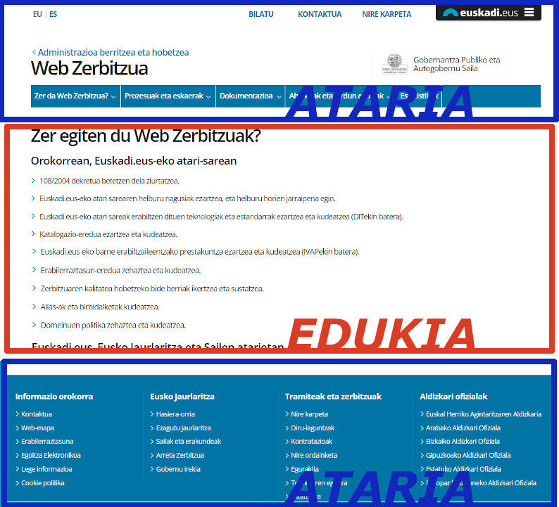 Hurrengo irudian, Eusko Jaurlaritzako sail baten webgunea ikus daiteke eta gorriz dago edukiari dagokion zatia eta, urdinez, atariari dagokion zatia: