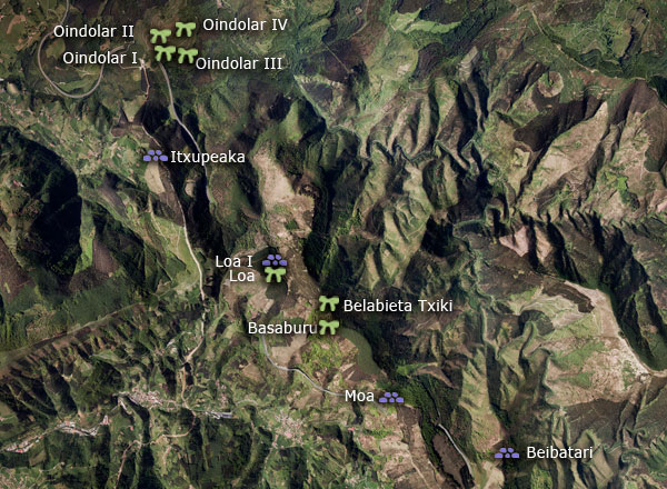 Panorama honetan, Oindolar I-eko trikuharria megalitoak, Oindolar III-ko trikuharria megalitoak, Oindolar II-ko trikuharria megalitoak eta Oindolar IV-ko trikuharria megalitoak ikus daitezke.