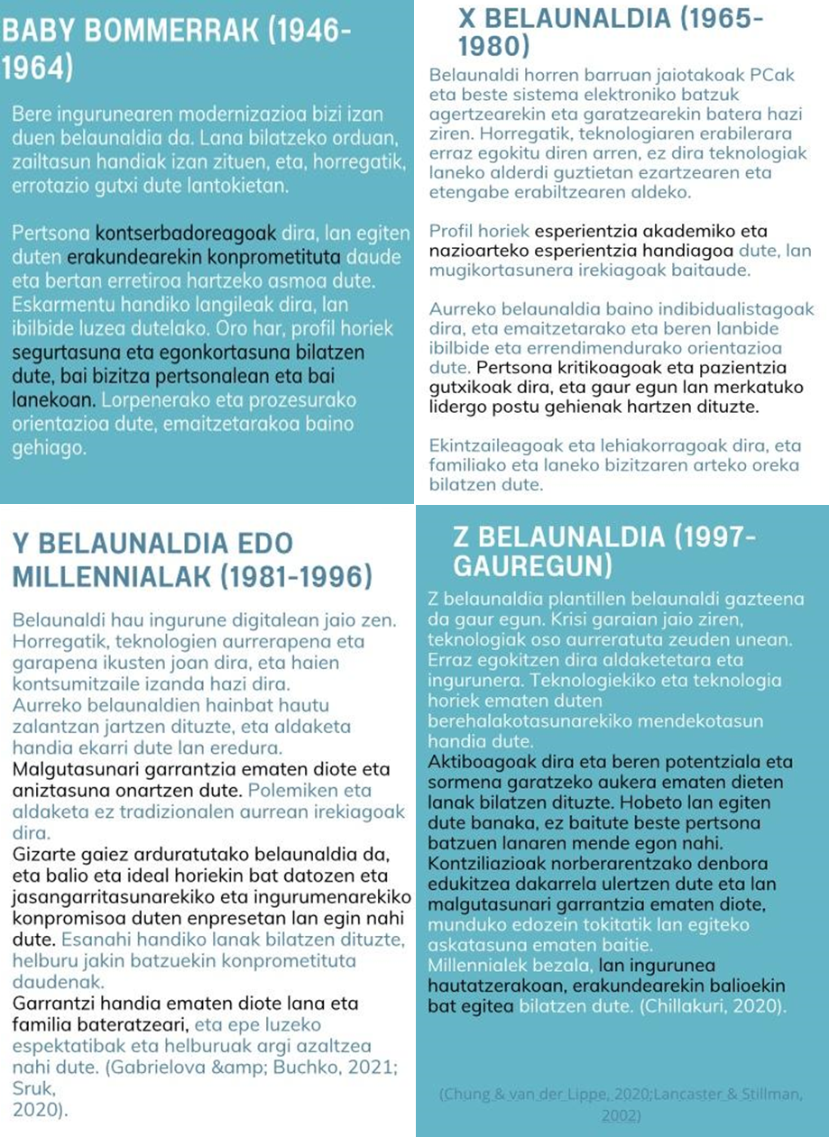 Oro har, arrakala handia dago egungo kudeaketa ereduen eta belaunaldi berrien –bereziki, Z eta Y belaunaldien– espektatiben artean, kudeaketa ereduak oraindik ere aurreko lan ereduetan oinarritzen baitira, nagusiki. Adibidez, Gabrielova eta Buchko (2021)-en azterlanek adierazten duten bezala, belaunaldi berriek aldaketa garaiak eta aukera berriak bizi dituzte, eta, aurreko beste belaunaldi batzuetan ez bezala, orain laneko egonkortasuna eta segurtasuna ez da faktore nagusia lana bilatzeko orduan. Ildo horretatik, ikerketa horren arabera, belaunaldi berrien berariazko ezaugarrietako bat da lan ingurune positiboetan eta giro osasuntsuetan lan egiteko duten interesa, pertsona eta profesional gisa aurrera egiteko eta prestatzeko aukerekin. Era berean, Mahmoud et. al.-en azterlanak (2021) belaunaldien arteko desberdintasunen inguruan adierazten du belaunaldi berrietako pertsonek berdintasunezko tratua nahi dutela eta ez hierarkia hain zurrunak, enpresa eredu tradizionalagoetan bezala (ikus, halaber, Tulgan, 2017).