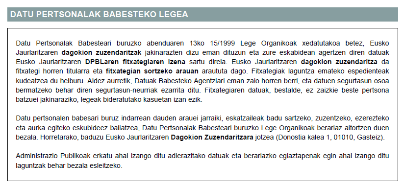 - Lehenengo paragrafoan, Administrazioak datuak sartuko dituen fitxategiaren ezaugarriak.