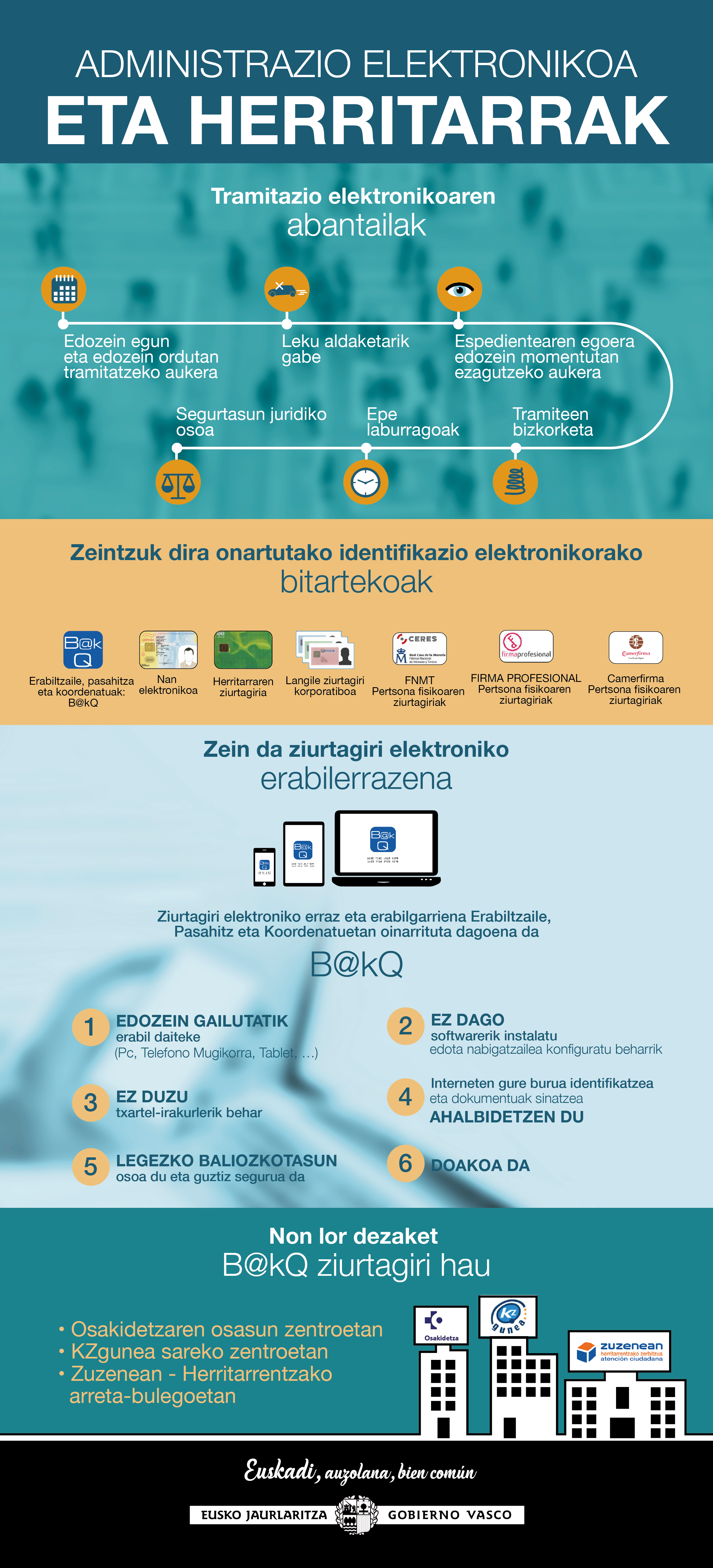 Infografia honetan, modu erraz eta bisualean erakutsi nahi ditugu administrazio elektronikoak herritarrei dakarzkien onurak eta modu elektronikoan tramitatzeko jarraitu beharreko bidea, beharrezko ziurtagiriak eta eskariak aurkezteko moduak eta lekuak barne hartuz.