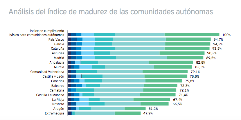 Arestian aipatutako legeen 132 eskakizunetan oinarritutako txosten honen arabera, Euskadi da autonomia-erkidegorik aurreratuena funtzionamendu digitalari dagokionez, eskakizun horien % 94,7 betetzen baitu, eta Euskadiren ondotik daude Galizia (% 94,2), Katalunia (% 93,5), Asturias (% 90,2) eta Madril (% 89,5).