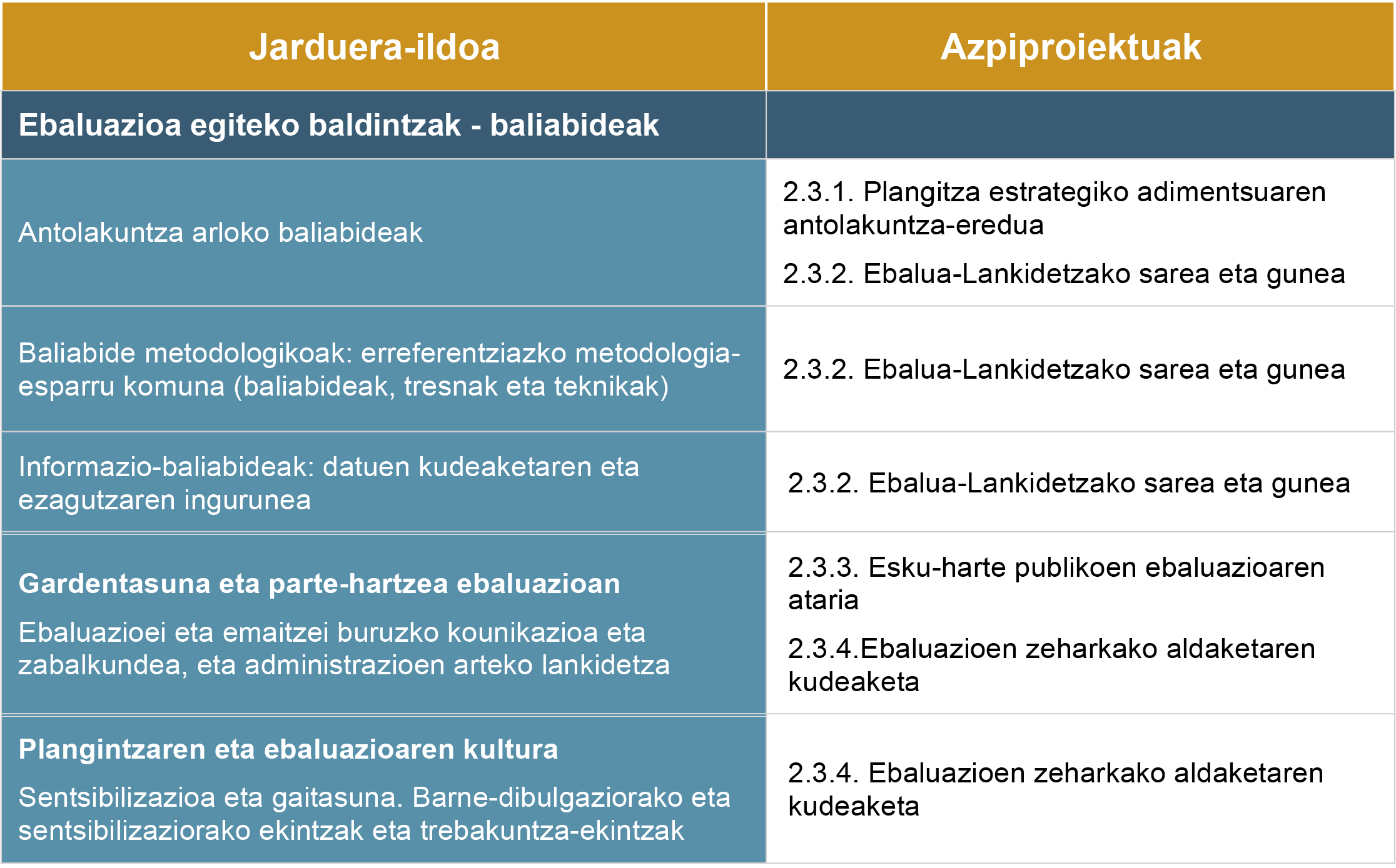 - Ebaluaziorako behar diren baldintzak eta oinarriak sortzea, ebaluazioa ohiko jarduera gisa txertatzeko esku-hartze publikoen programazio, plangintza eta ezarpen zikloan.