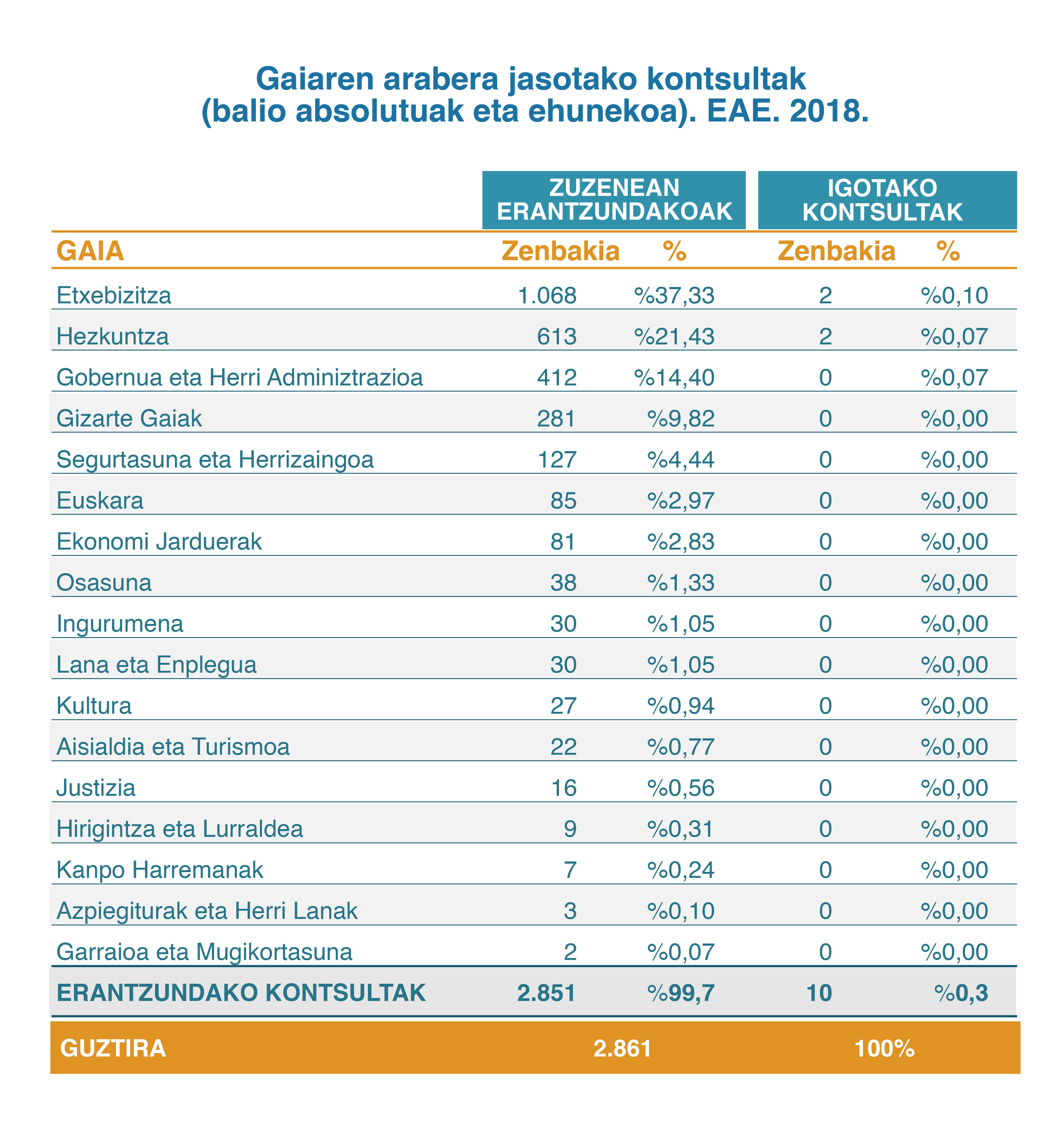 Kanal honen bitartez, era askotako mezuak jaso dira. Zerbitzuei buruzko informazio eskaeretatik erabiltzaileak kezkatzen dituzten gaiei buruzko orientazio eta aholkularitzaraino. Oro har, urte hauetan kontsulta gehien eragin duten gaiak Etxebizitza eta Hezkuntzaren ingurukoak izan dira.