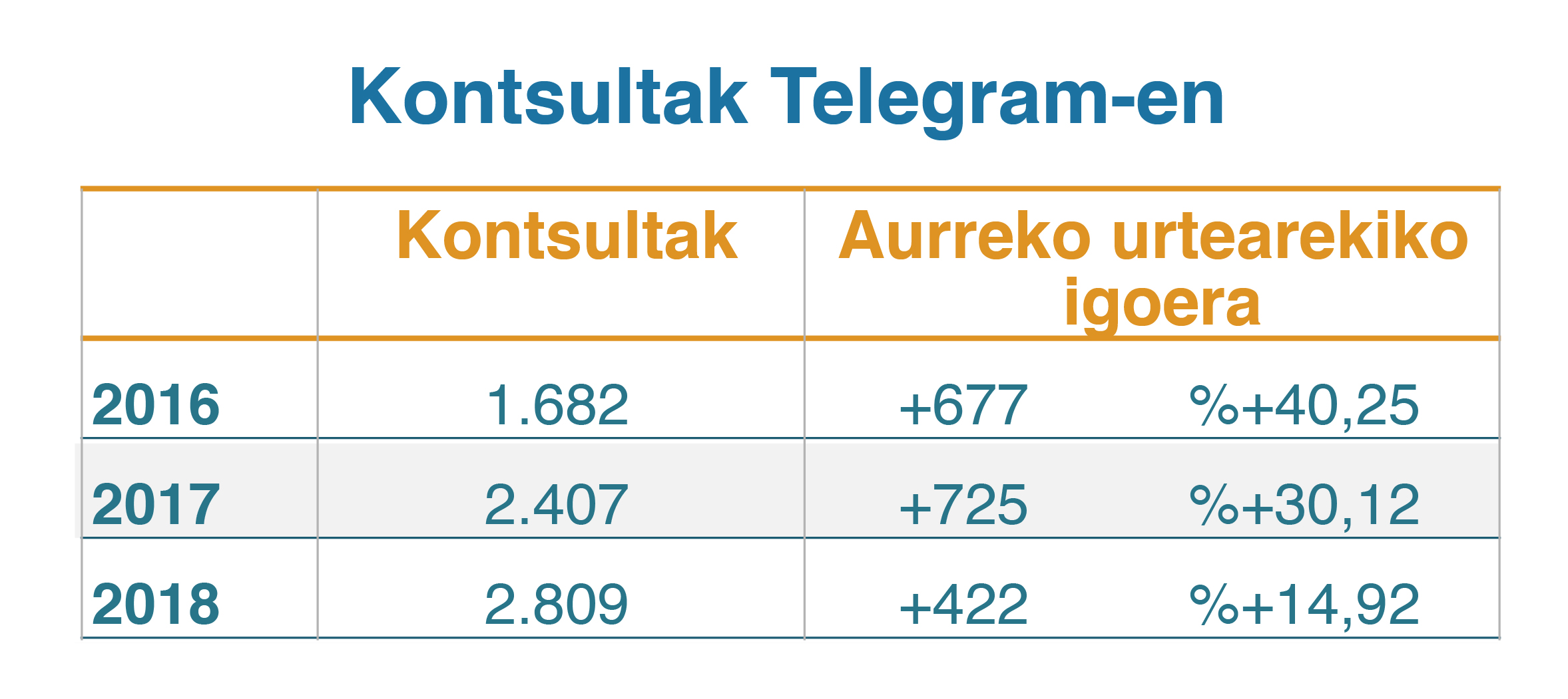 Horren harira, Whatsapp bat-bateko mezularitza-aplikazioarekin 2014ean abiarazi zen esperientzia pilotuaren ondoren, Zuzenean Herritarren Arreta Zerbitzuak Telegramen bidezko mezularitza zerbitzua martxan jartzea erabaki zuen 2015ean, eta urtez urte, gero eta herritar gehiagok erabiltzen dute, iaz kanal honen bitartez 3.000 kontsulta inguru artatu zirelarik.