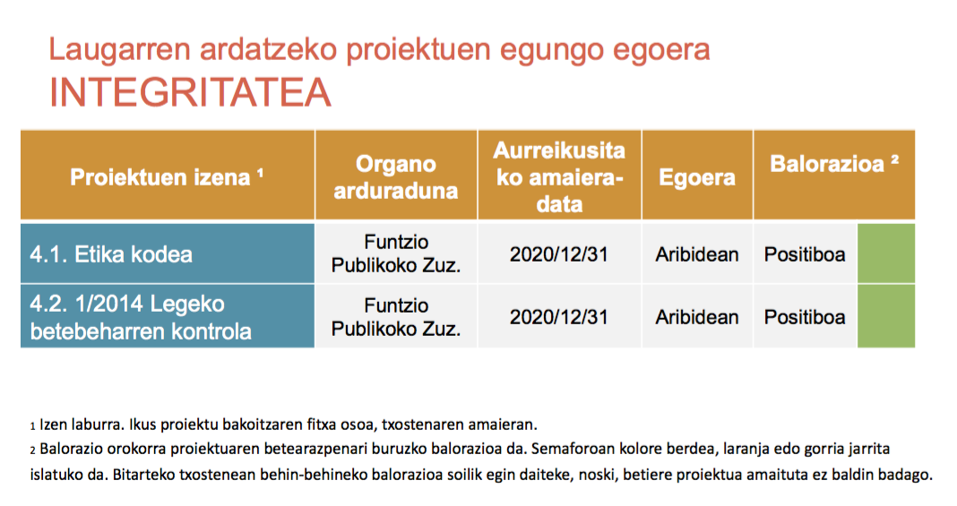 Orain arte, jarraipen-post bat argitaratu da lehen hiru ardatz estrategiko bakoitzeko. Oraingo honetan, "integritateari" dagokion 4. ardatz estrategikoren bilakaeraren eta betetze-mailaren berri emango dugu.