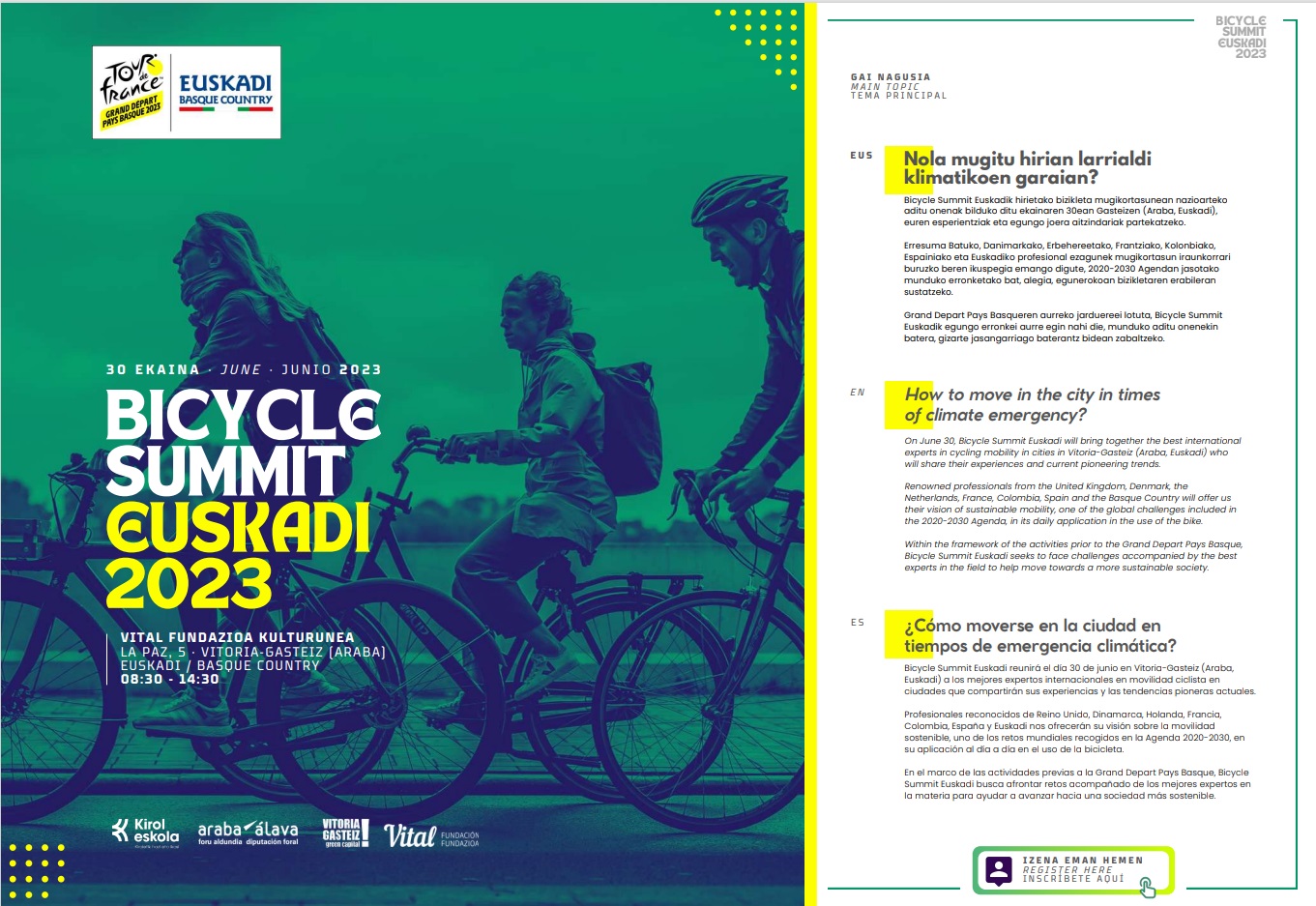 Tourrak Euskaditik egingo duen irteera handiak mugikortasun jasangarrian, bizitza osasungarrian eta turismoan sakonduko du Bicycle Summit Euskadi 2023 programarekin. Kongresu hau ekainaren 30ean, goizez, egingo da Vital Fundazioa Kulturunean, eta hirietako bizikleta bidezko mugikortasunari buruzko nazioarteko aditu onenetako asko bilduko ditu, beren esperientziak eta egungo joera aitzindariak partekatuz.