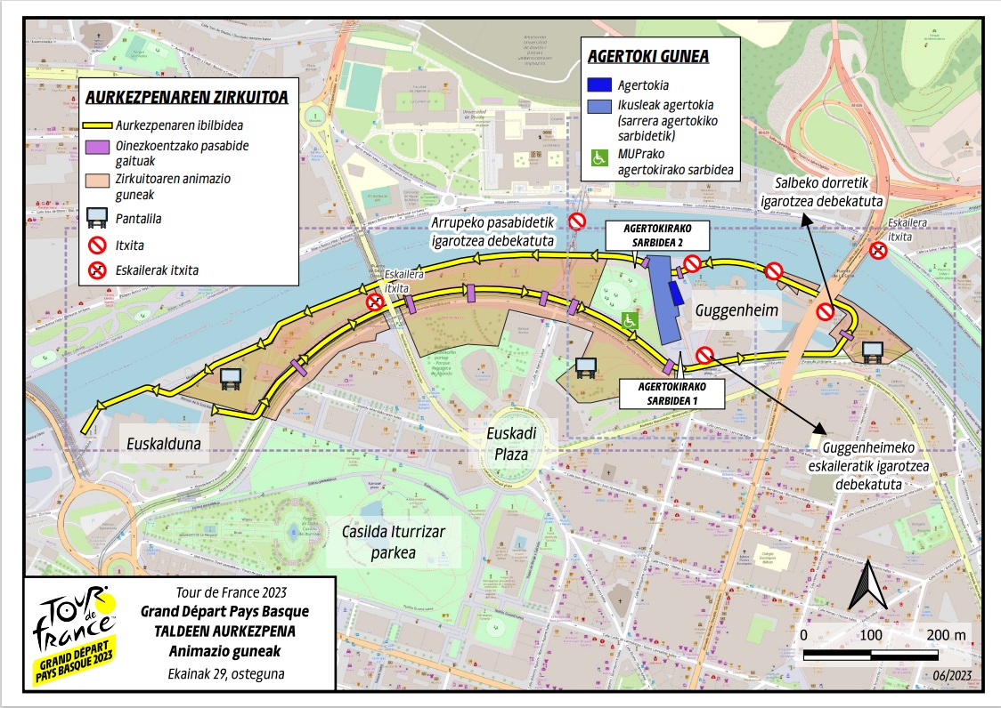 Publikoak doako ekitaldi honetan parte hartu ahal izango du taldeek Euskalduna Jauregitik Guggenheim Bilbao Museoraino egingo duten zirkuitu osoan zehar. Bertaratutakoek txirrindularien ibilbidea jarraitu ahal izango dute, bai Euskalduna Jauregitik Guggenheim Bilbao Museoraino egingo duten joan-etorriko zirkuitu zirkularrean (mapa erantsi da), baita Museoaren zabalgunean ere. Gune horretara sartzea ere doakoa izango da, ikusleak 16:00etatik aurrera sartu ahal izango dira, baina zaleen sarrera kontrolatuko da ekitaldia behar bezala eta seguru garatzeko baimendutako edukiera errespetatuz. Ibilbidean zehar hiru pantaila erraldoi ere jarriko dira, zaleek taldeen aurkezpenaz zuzenean gozatzeko aukera izan dezaten.