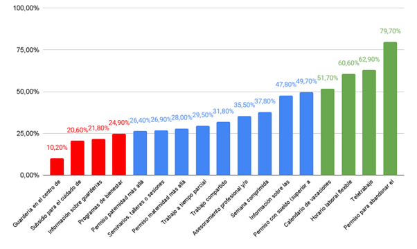 Tal y como se muestra tanto en el informe del estudio, como en la herramienta, hay un desajuste generalizado entre las medidas que declaran necesitar las personas trabajadoras y la disponibilidad de estas medidas por parte de las empresas. De igual manera, hay un desajuste entre las medidas que ofrecen las empresas y las que demandan las personas trabajadoras.