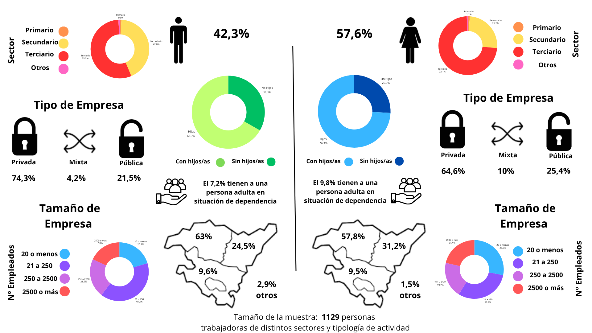 Para conocer estas distintas realidades en torno a la conciliación, se han realizado entrevistas a 1.129 personas trabajadoras de los tres territorios, de diferente sexo, edad y sector de actividad.