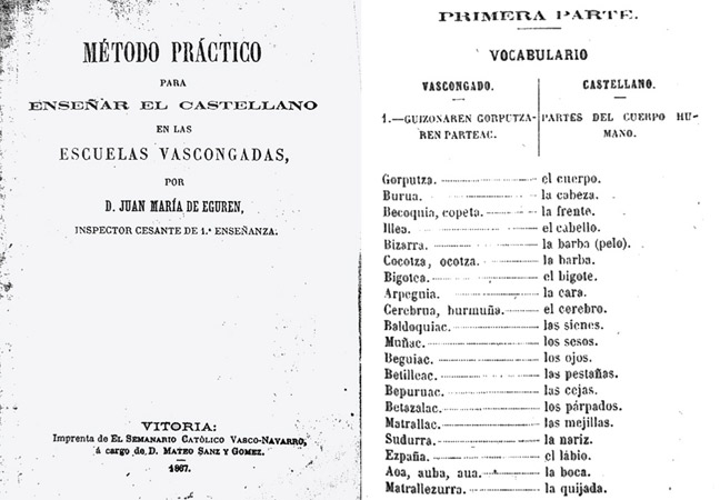 Egurenen metodoa Gipuzkoako euskaldunei gaztelera irakasteko 1867an argitaratu zuen metodoa gaztelera ez jakiteak herritarrari sortarazten zizkion arazoak saihesten laguntzera zetorren. Bertan eskoletan gaztelera irakasteko zein prozedura eraman proposatzen zen: irakasleak egunero tarte bat hartu beharko zukeen gaztelera irakasteko, horretarako ikasleak lau talde handitan banatuz, eta talde hauek hamarnakako behar adina taldetan bilduz. Bai hitzak, esaldiak etab. lehenik euskaraz zeuden bezala ikasi behar zituzten eta gero gazteleraz, itzulpen ariketak eginez. Dotrina ere euskaraz galdetzea komenigarria ikusten zuen, ikasleei gazteleraz erantzun araziz. Lehenengo euskaraz, gero gazteleraz. Eta, ondoren, lehenengo gazteleraz eta gero euskaraz esanarazi behar ziren liburuko atal bakoitzeko edukiak. Helburua ez zen izan herritarren artean euskara lantzea, berau gaztelera tinko ezartzeko bide bat baino. (Koldo Mitxelena. Fondo Gordeak: J.U.4178b. Argazkia egilearena.)
