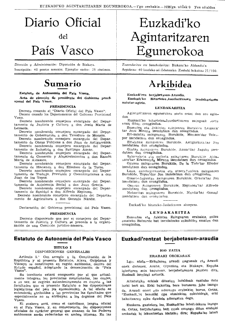 1979an Euskal Autonomi Erkidegorako onartu zen Estatutuak, bere 6gn puntuan hau dio: