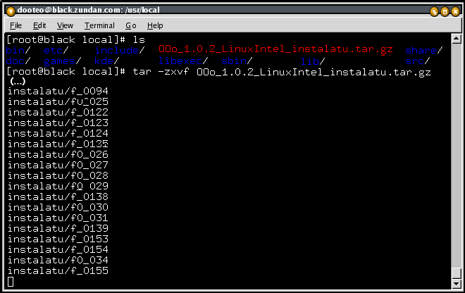 - OOo-ren (OpenOffice.org era laburrean idatzia) kopia egin ondoren hau deskonprimitu behar da. Horretarako tar agindua erabiliz (Oharra: hor ageri den ls aginduak direktorio bateko edukia zerrendatzen du):