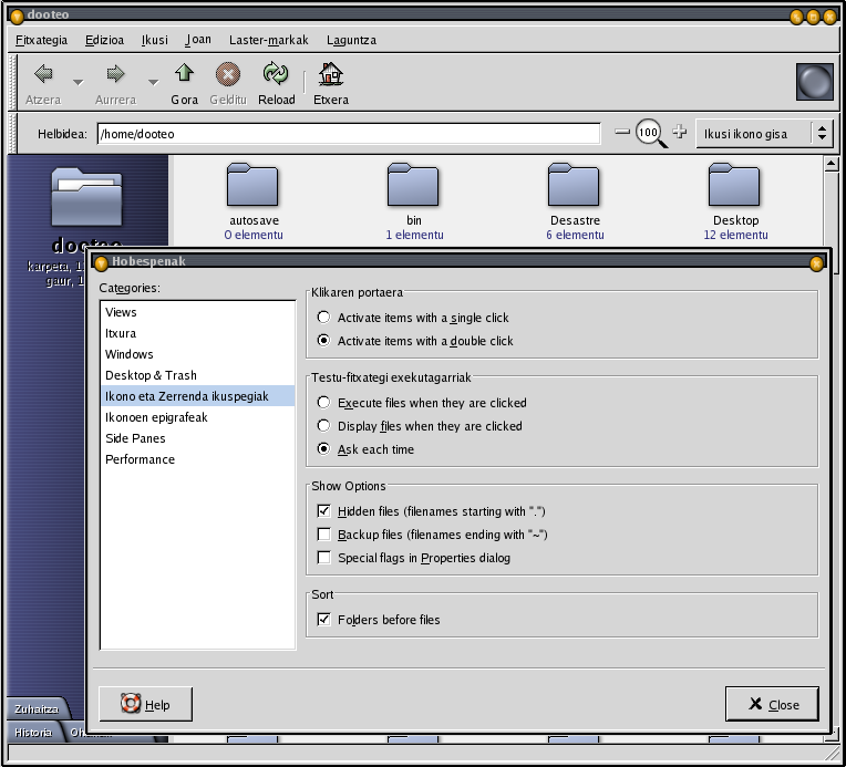 Horrek azpiko irudian agertzen den bezalako leihoa sortzen du. Ezkutuko direktorio edo karpetarik ez badu zerrendatzen (. ikurrarekin hasten direnak) hautatu Edizioa -> Hobespenak -> Ikono eta Zerrenda ikuspegiak eta aktibatu Ezkutuko fitxategiak (edo Hidden files).