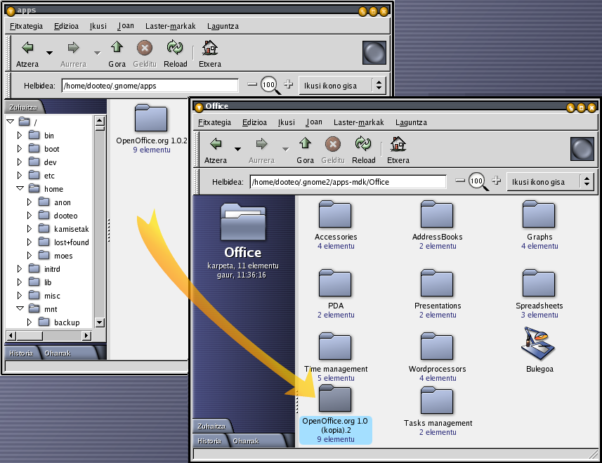 - Gauza berdina, baina azkarrago, egiteko OOo erabiltzailearen etxean sortzen denean .gnome/apps izeneko direktorio ezkutuan sortu duen karpetaren (direktorioaren) esteka bat sortzea da. GNOME 2 mahaigaina erabiltzen baduzu, orduan ondorengo esteka landu ezazu: