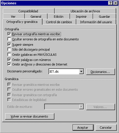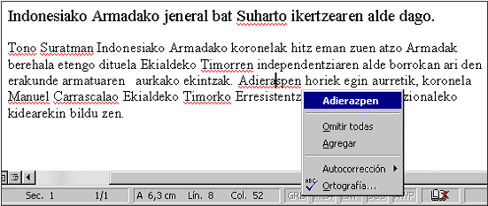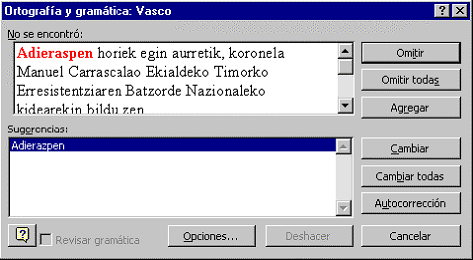 Bestela, idatzi ahala egiaztatu nahi ez denean alegia, Tresnak (Tools, Herramientas) menuko Ortografia eta gramatika (Spelling and Grammar, Ortografía y gramática) aukeraz baliatuko gara ortografia egiaztatzeko. Ezagutzen ez diren hitzetarako zenbait aukera eskaintzen du: