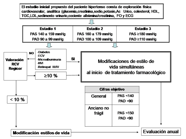 Las cifras objetivo son PAS < 140 y PAD < 90 mm Hg aunque deben individualizarse dependiendo de la edad, cifras de PA previas y otros tratamientos que reciba el paciente. En el paciente anciano (> 80 años) no frágil se sugieren cifras de PAS < 150 y PAD < 90 mm Hg