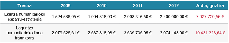 Ekintza humanitarioko esparru-estrategiei dagokienez, 2009tik 2012ra bitarte 15 estrategia onartu dira guztira, eta estrategia horietara 7.927.720,55 € bideratu dira guztira.