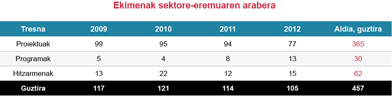 Guztira 457 ekimen onartu dira, 4 kategoriatan banatuak: 365 lankidetza-hitzarmen eta garapen-hezkuntzarako proiektu, 30 lankidetzarako programa eta 62 hitzarmen.