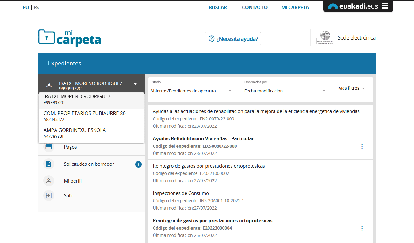 En este ejemplo se muestra que la persona "IRATXE MORENO RODRIGUEZ", además de actuar en nombre propio, puede actuar también en nombre de dos entidades: "Comunidad de Propietarios Zubiaurre 80" y la "Ampa Gordintxu Eskola"