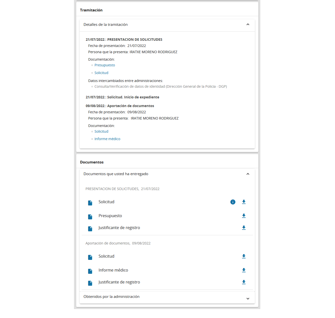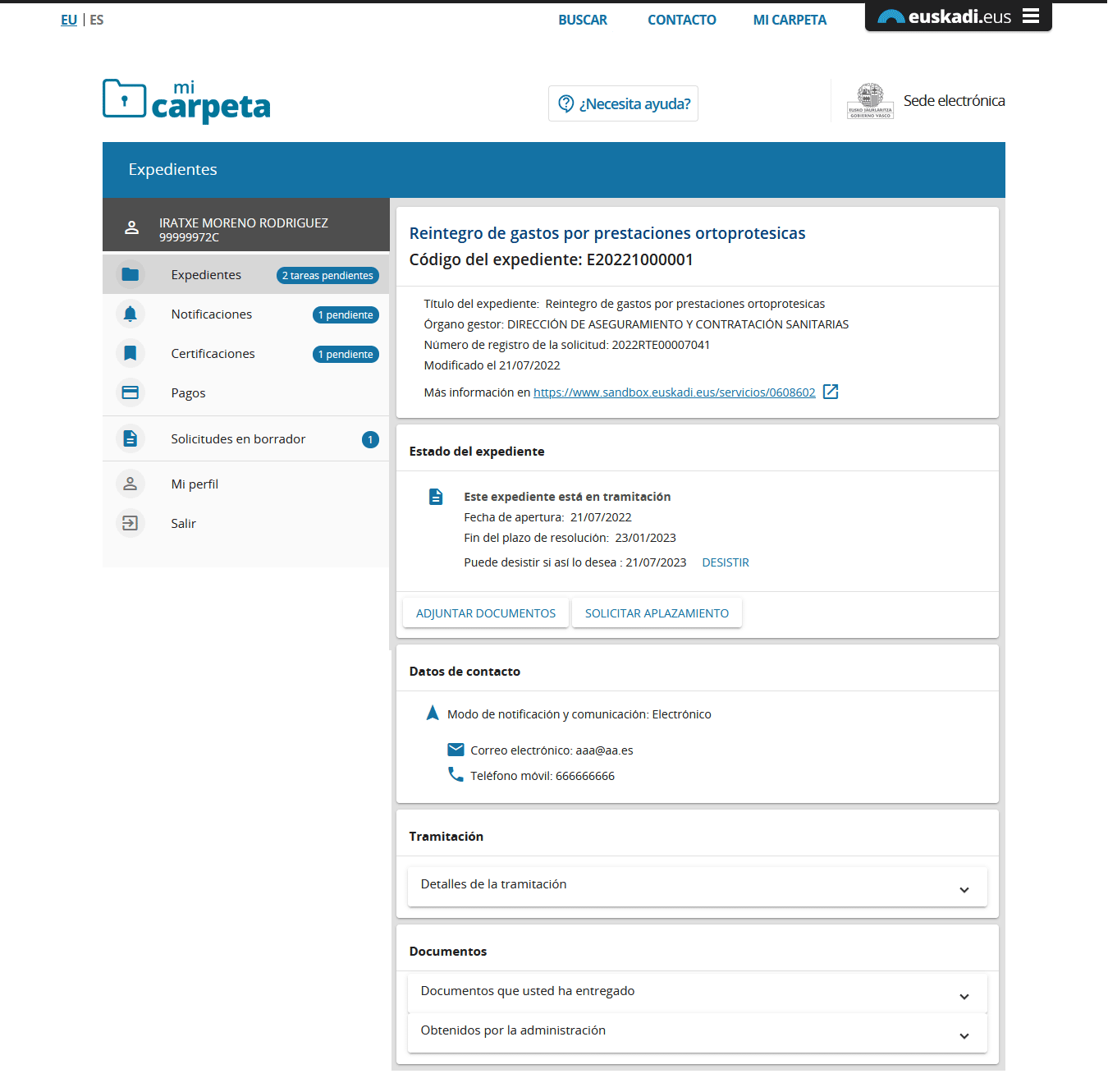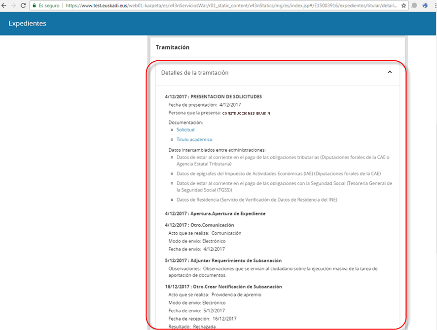 Si accedemos ahora a Mi carpeta, el expediente correspondiente muestra los últimos documentos aportados. Los podrá consultar en los apartados "Detalles de la tramitación" y "Documentos":