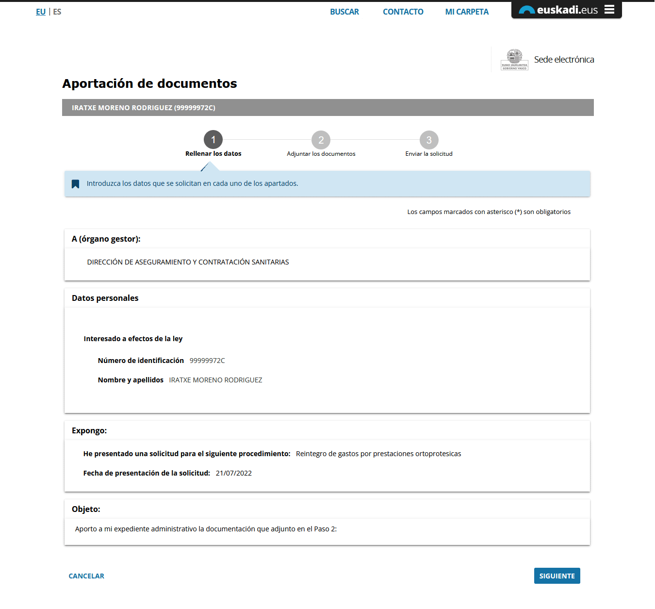 El formulario de Aportación de documentos muestra un resumen de la información aportada.