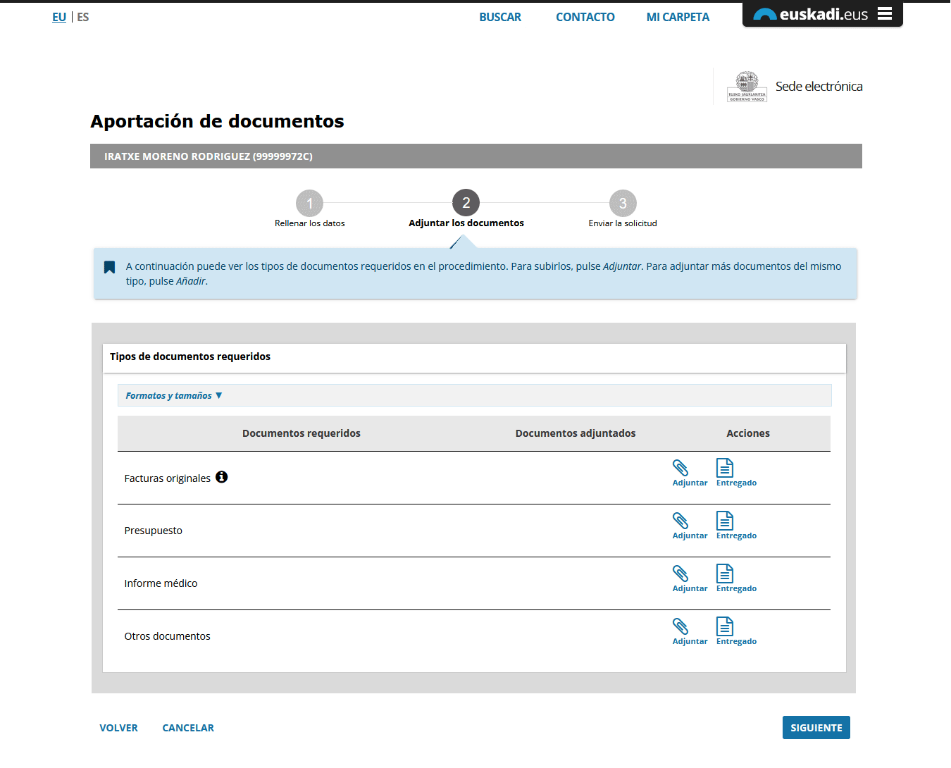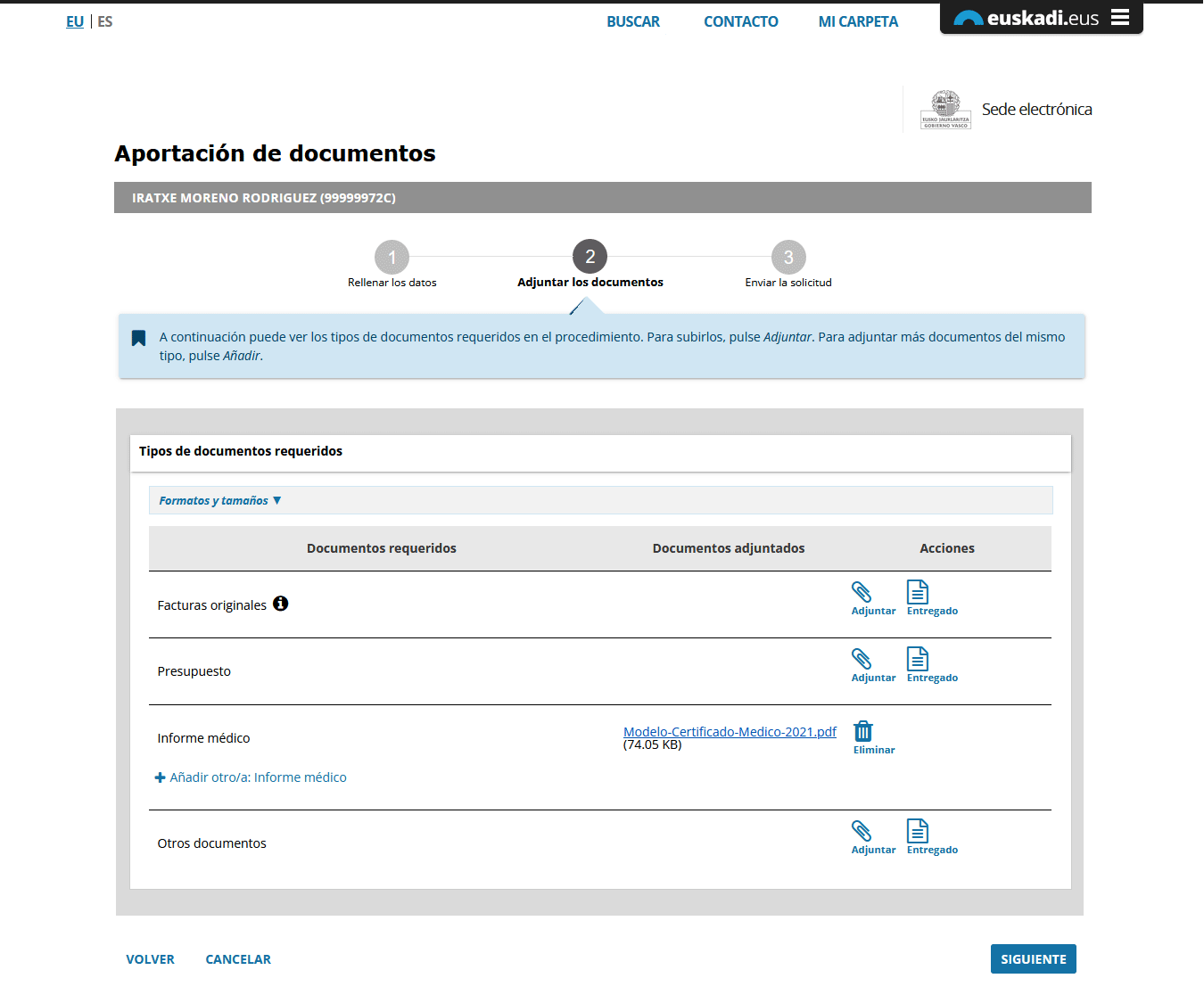 En el paso 2 “Adjuntar los documentos” se relacionan la tipología de documentos a adjuntar (en el ejemplo: facturas, presupuesto, informe médico...)