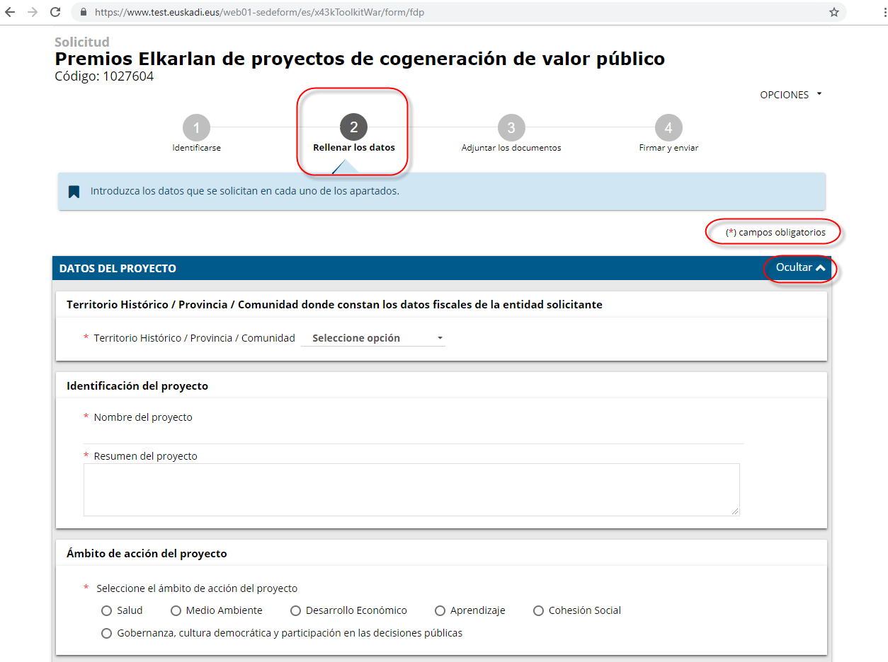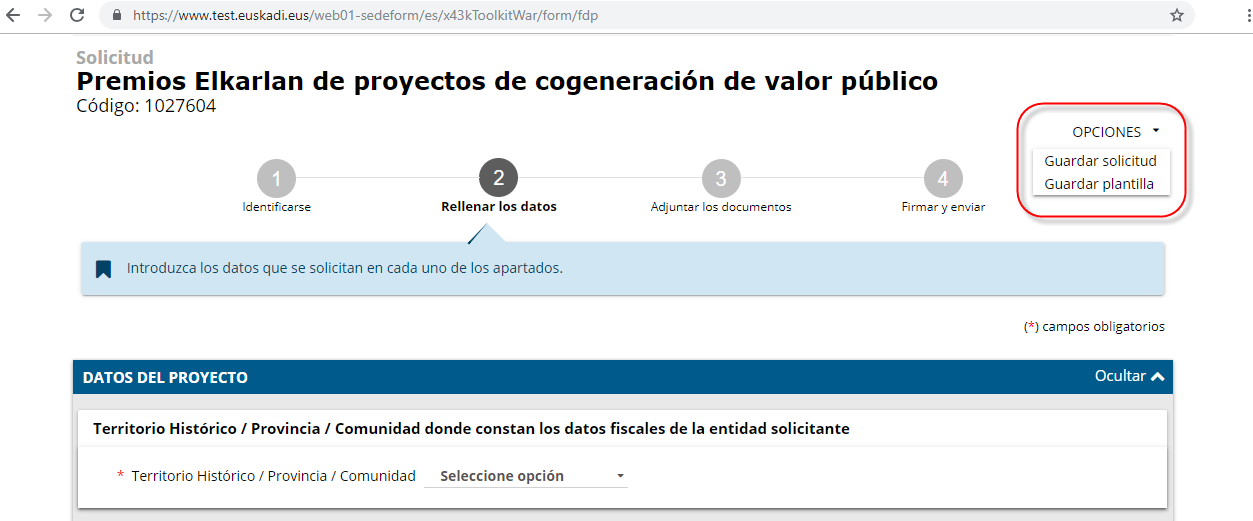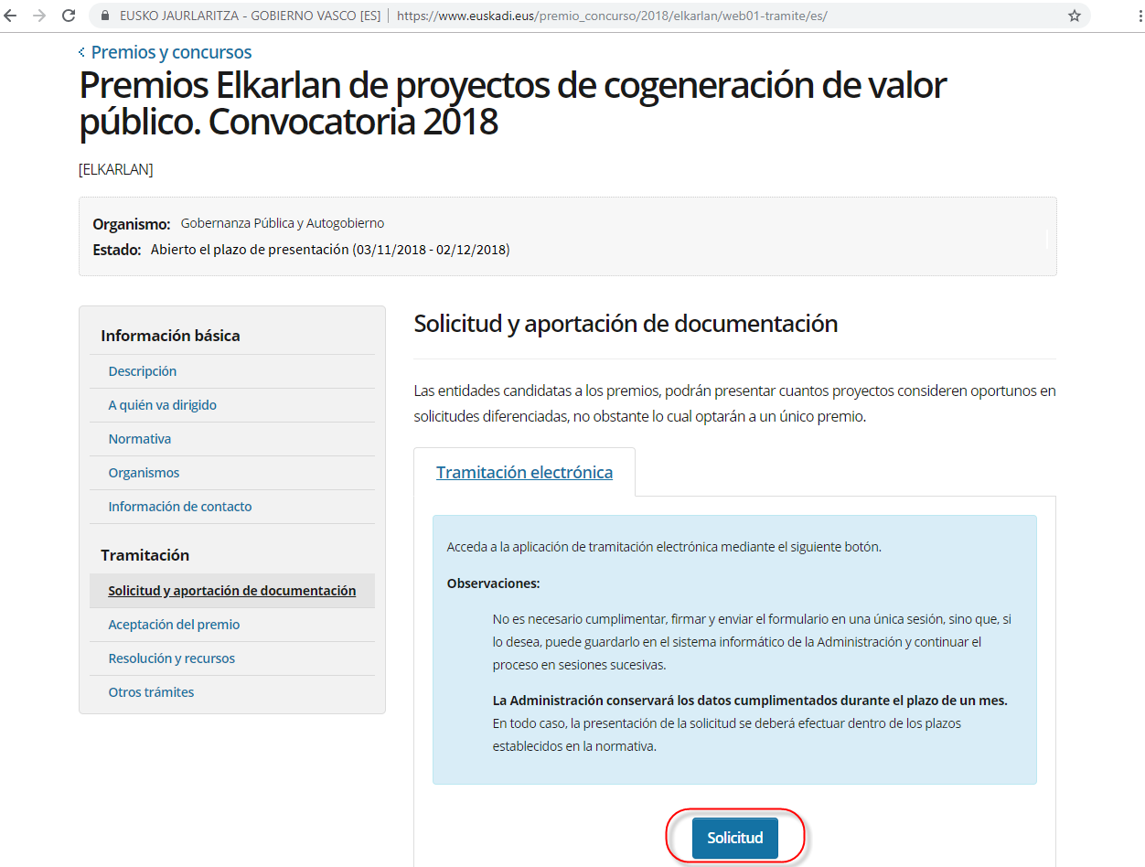 NOTA: Para la confección de la presente Guía, a modo de ejemplo, vamos la tramitar la solicitud de un premio, Premios Elkarlan de proyectos de cogeneración de valor público.
