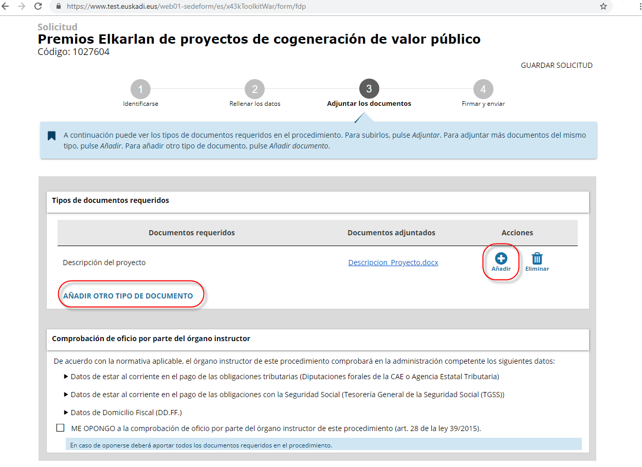NOTA: La opción “Guardar solicitud”, NO significa que la solicitud ha sido enviada y registrada en la Administración. Para lograr que la solicitud sea registrada en la Administración, se debe finalizar el Paso 4 "Firmar y enviar".