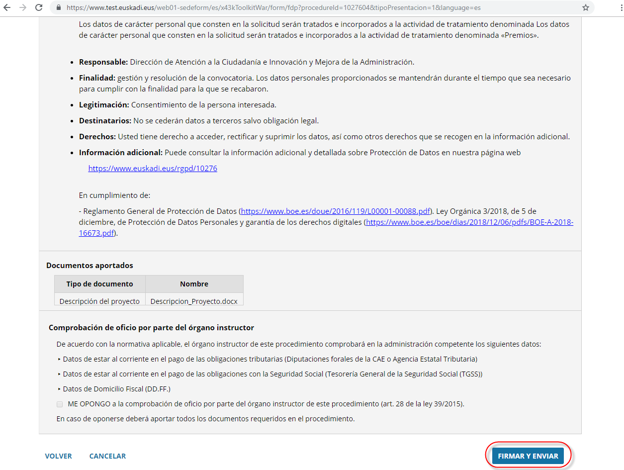 Si se está de acuerdo con los datos introducidos y los documentos aportados, seleccionamos el botón “Firmar y Enviar”.