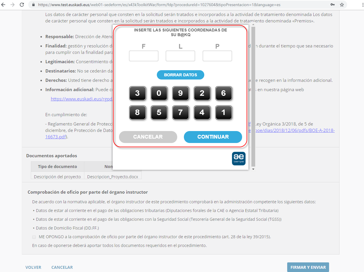 Introducimos los valores de las coordenadas solicitadas del certificado BakQ.