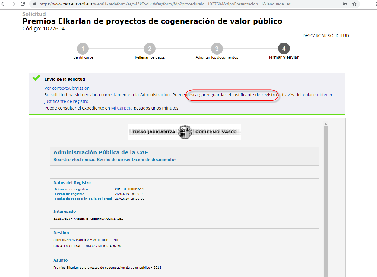 Por favor, descargar y guardar el justificante de registro. Este documento le permitirá disponer de un elemento justificativo del registro de entrada de su solicitud en la Administración.