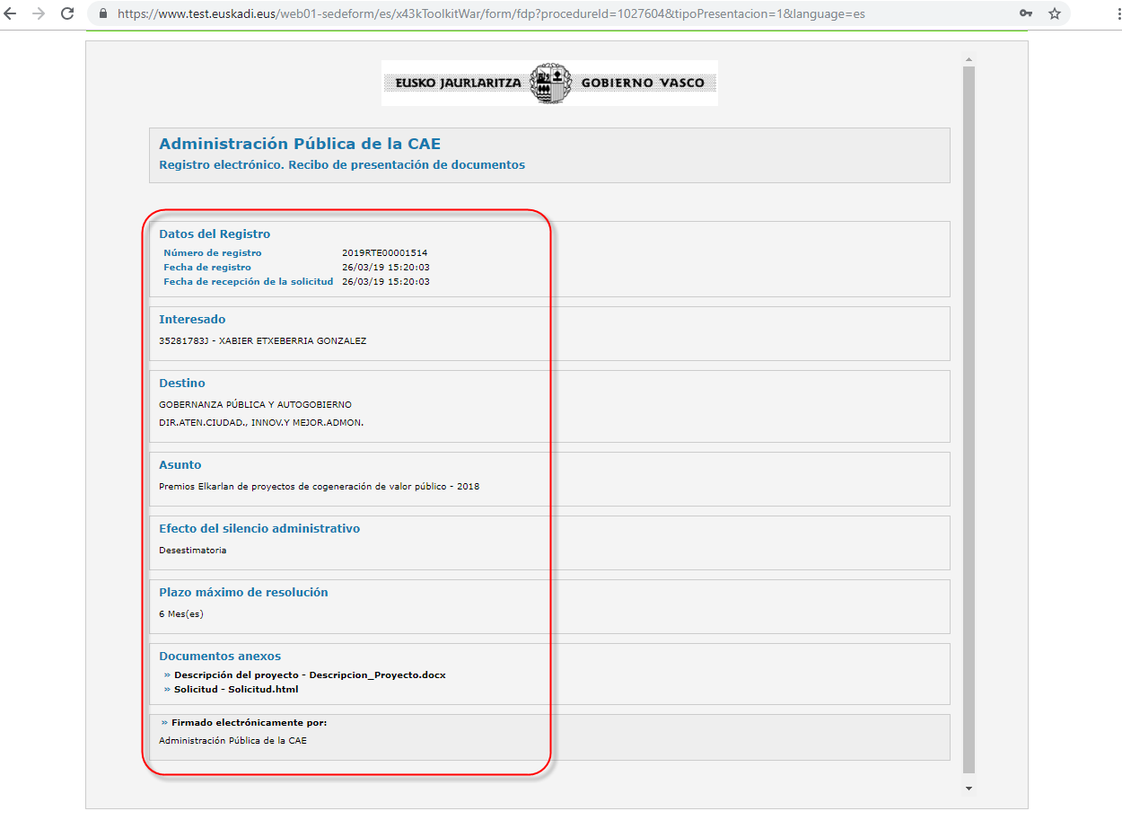 - Una vez enviada la solicitud correctamente, se obtiene el justificante del registro electrónico. El justificante de registro contiene todos los datos señalizados en la tramitación, así como, los datos y número de registro.