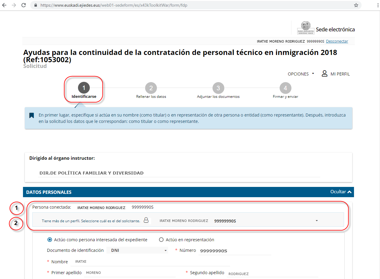 Así, el sistema identifica quién es la persona conectada (1), y además identifica que esa persona dispone de más de un perfil de solicitante (2) en esta Administración (la información de los perfiles de solicitantes se extrae del Registro de Representantes).