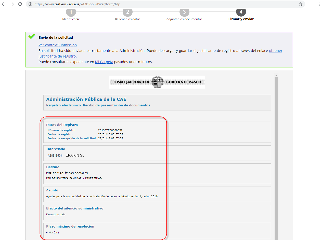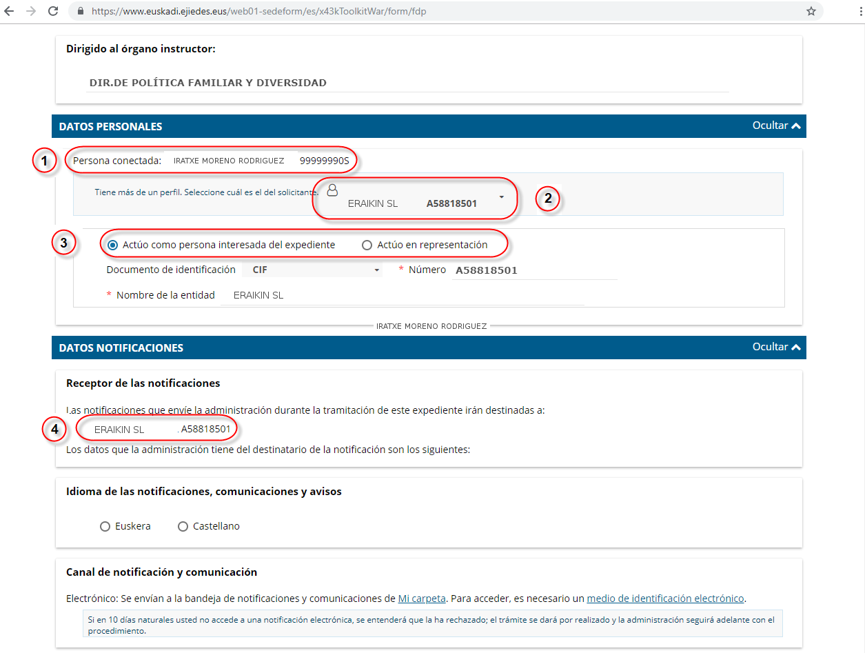 Es decir, en este ejemplo, es la entidad "ERAIKIN SL A58818501" (2) quién actua como titular de la solicitud (3) y a la que se le enviará las notificaciones (4).