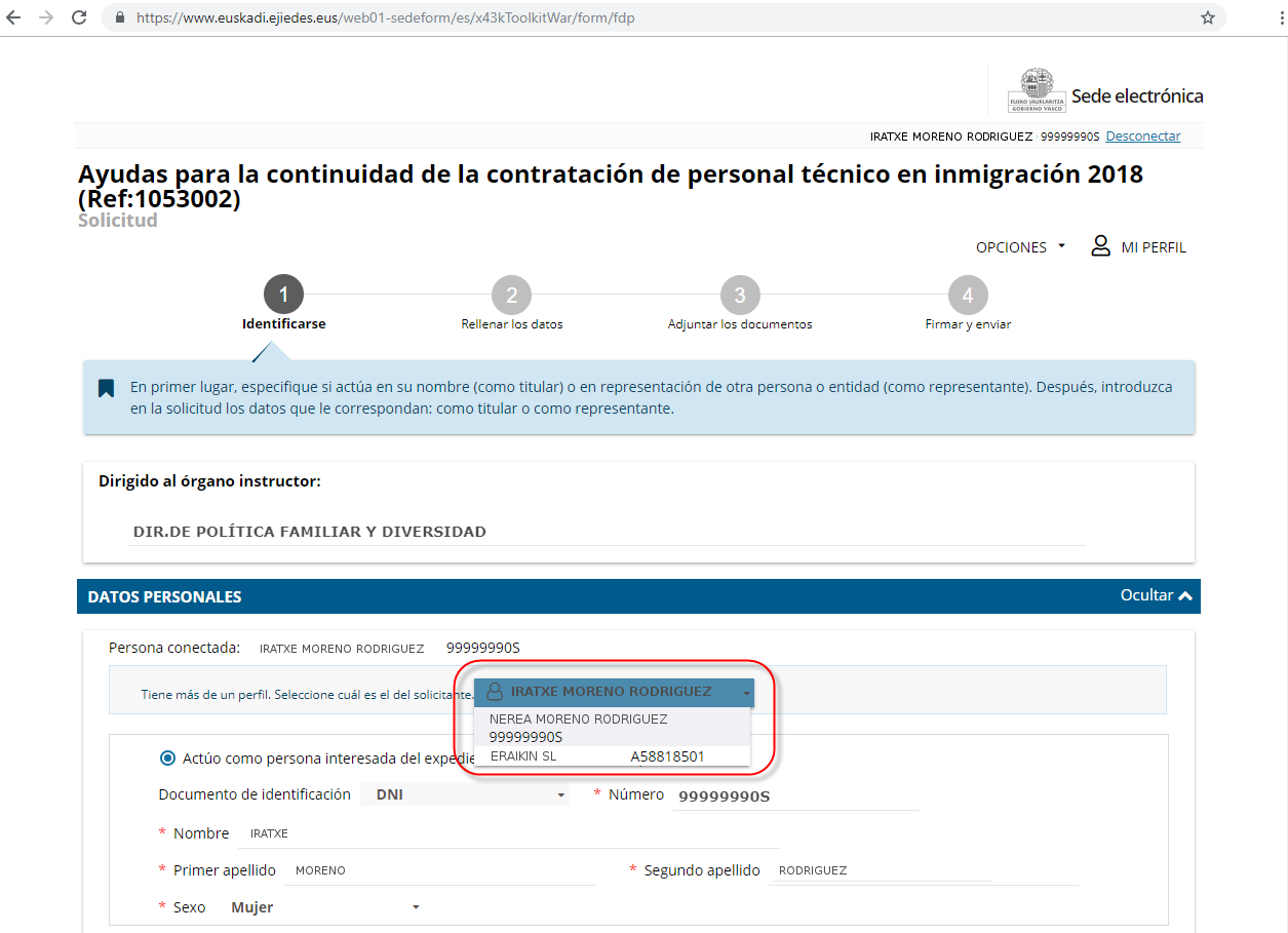 En este ejemplo, el solicitante además de su perfil personal (Ejemplo, IRATXE MORENO RODRIGUEZ, 99999990S) , dispone de un perfil de empleado de entidad (Ejemplo, ERAIKIN SL A58818501)