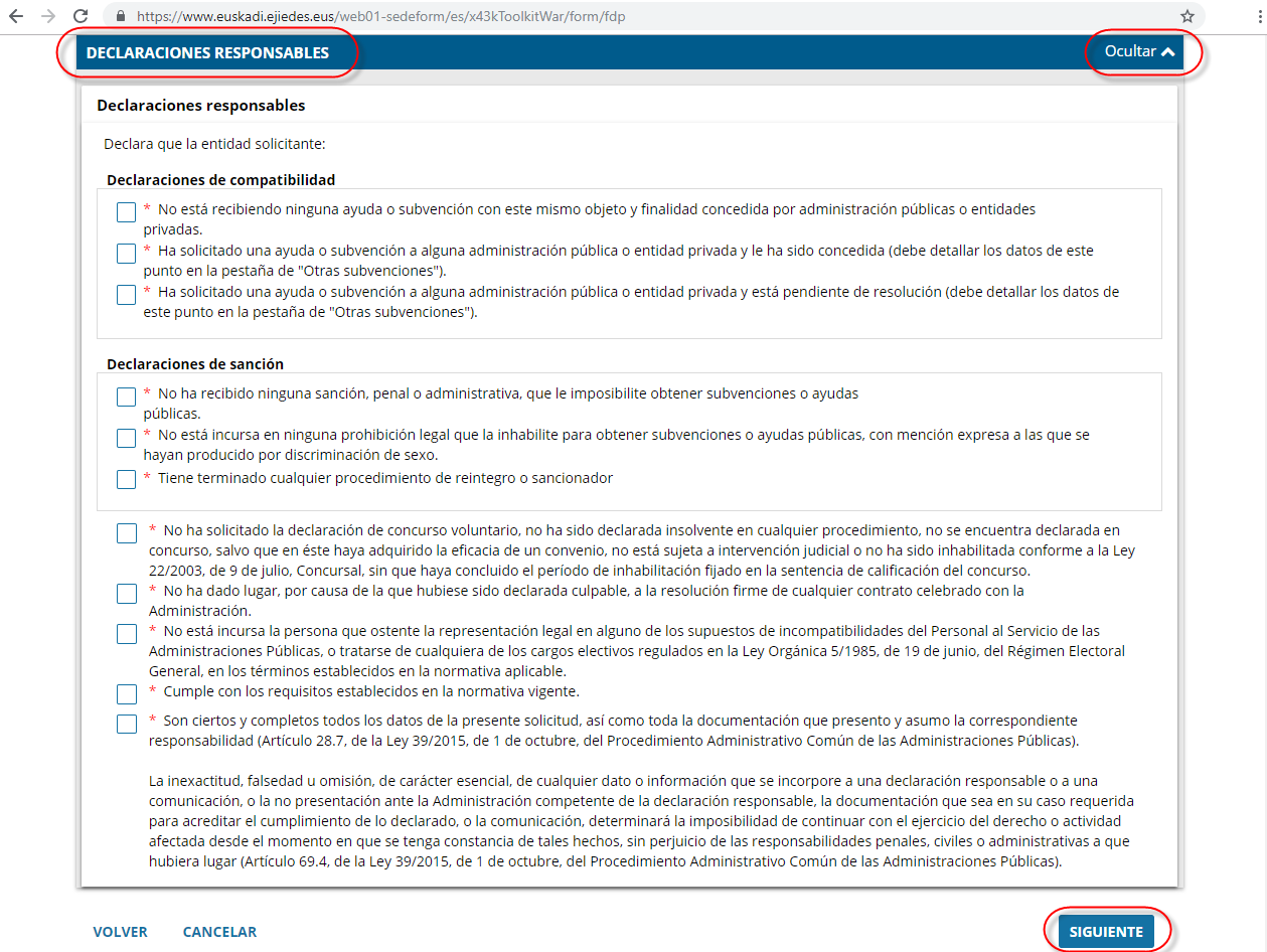 Todos los formularios de solicitud disponen de una pestaña final denominada “Declaraciones Responsables”.