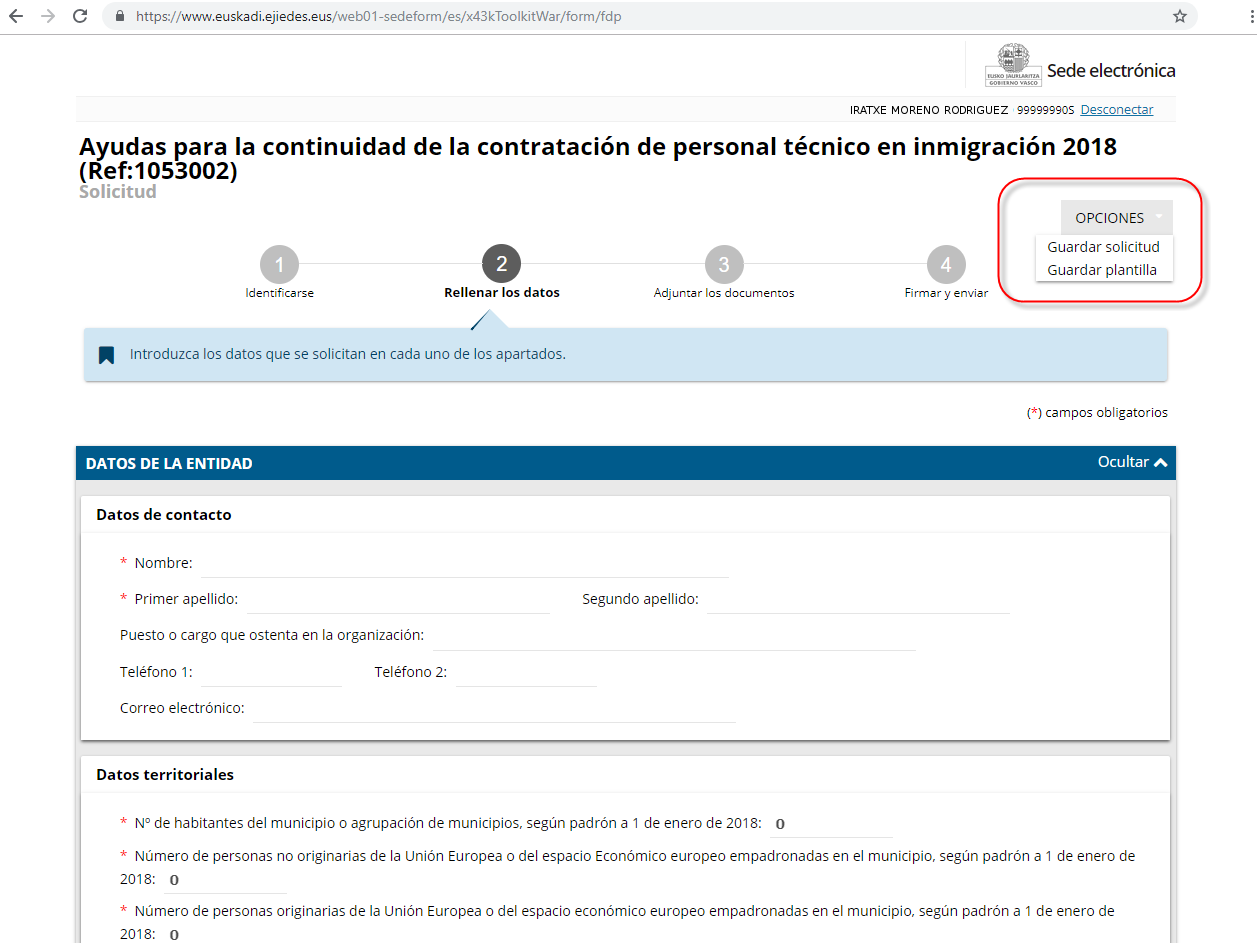 IMPORTANTE: En el proceso de la cumplimentación de la solicitud, es recomendable ir guardando lo que vamos introduciendo (similar a la opción de “Guardar como…” de Word), a través de la opción “Guardar solicitud”. Esto nos asegurará que no perdamos los datos introducidos si se produce alguna incidencia (finalización de la sesión, caída de tensión, etc.)