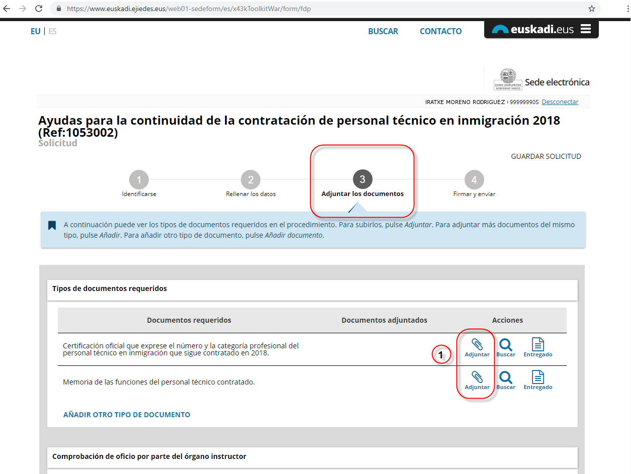 Para adjuntar los documentos requeridos seleccionamos el icono “Adjuntar” (1).